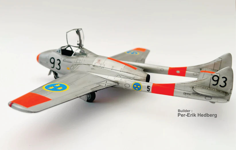 The Swedish Air Force received the first delivery of 20 aircraft starting in February 1953. Sweden had 3 versions of the 2-seater Vampire (trainer Mk.55), J 28C-1, J 28C-2; J 28C-3. The C-1 version had, among other things a different type of canopy glazing than C2 & C3. C2 & C3 had more elegantly curved dorsal fins. The C-2 and C3 were identical except that the C-2 was produced as a training aircraft in England and the C-3 was converted from the single-seat Vampire (J 28B) where the conversion took place in Sweden. The kit represents version C-2/C-3. In addition to training student pilots, the Swedish Air Force used the 2-seater Vampire for weather flights, VIP flights, liason flights and flight training.