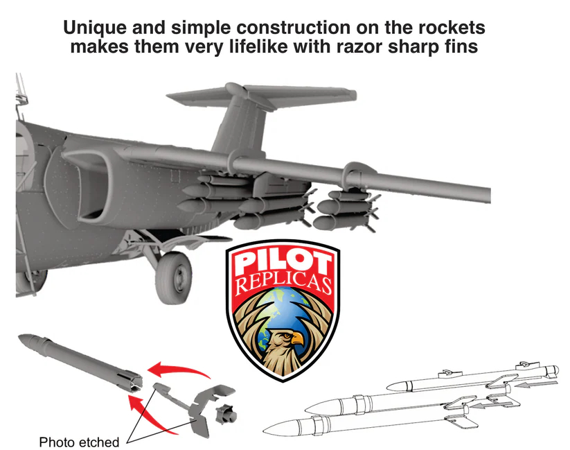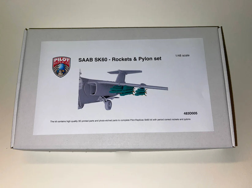 Weapon kit including A60 & K60 pylons for SK60. Unique and simple construction on the rockets makes them very lifelike with sharp razor fins. Options to make 135/145mm rockets. The parts are 3D printed with the absolute highest quality and this is supplemented with phot etched rocket fins. Kit includes 12 rockets and 6 pylons.